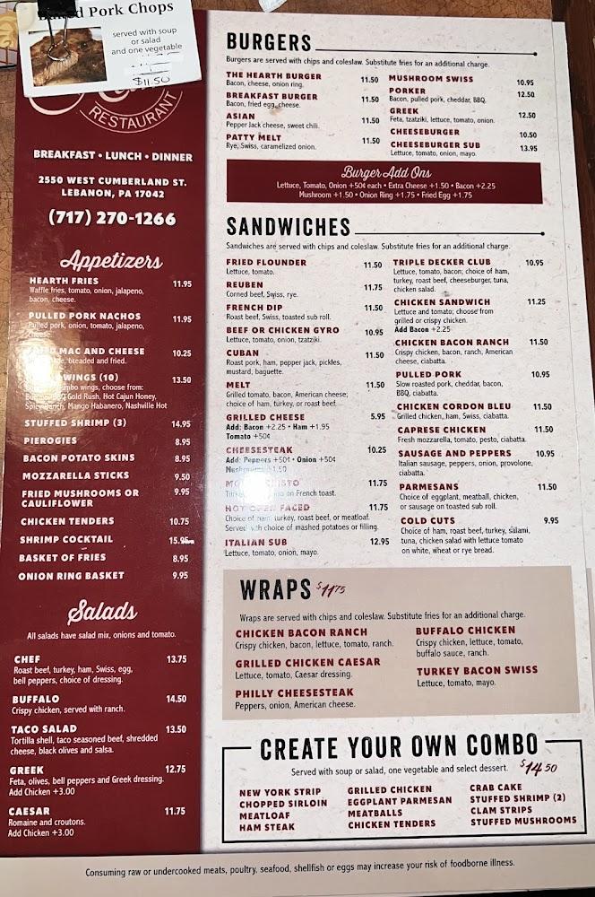 Welcome to The Hearth Family Restaurant, a beloved family-owned diner located at 2550 Cumberland St, Lebanon, PA. Our extensive menu features all your favorite comfort foods, perfect for satisfying any craving throughout the day. Whether you're in the mood for breakfast, lunch, or a cozy dinner, we have something for everyone, including scrumptious local specialties and delightful desserts. Enjoy swift service in our warm, inviting atmosphere, complete with a charming fireplace. We offer takeout, delivery, and convenient wheelchair access. Join us for a meal and experience the warmth of family dining at The Hearth!